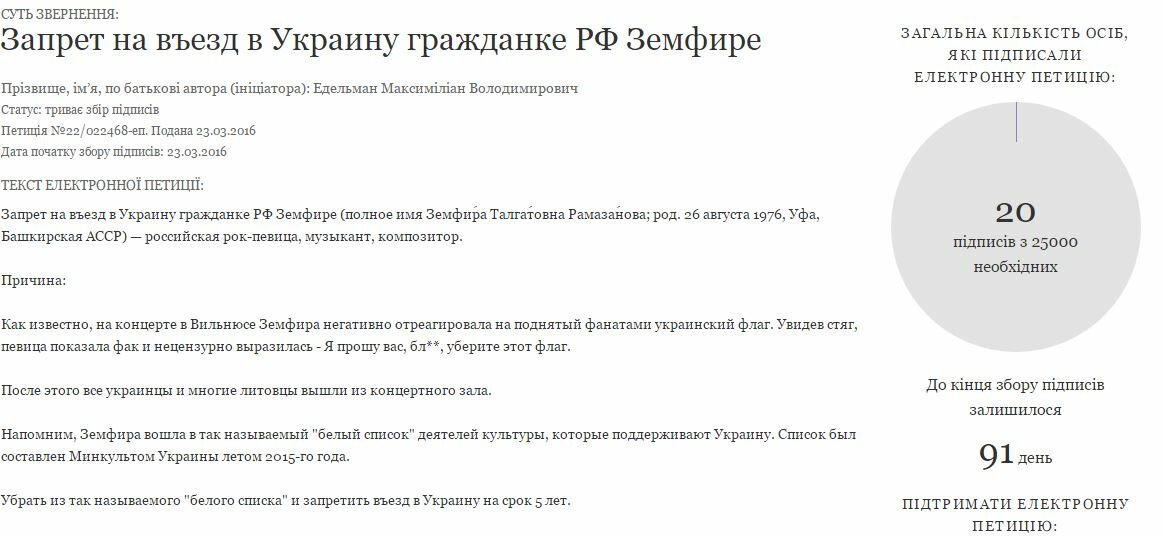 На официальном сайте Петра Порошенко 23 марта появилась новая петиция. Ее автором является некто Эдельман Максимилиан Владимирович. В тексте петиции говорится о том, что следует исключить Земфиру из списка тех, кто может приезжать на Украину с мероприятиями.