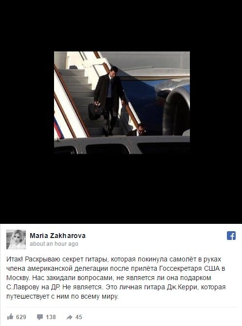 Как сообщила Захарова, необычный предмет на борту американской делегации не имеет ничего общего с днем рождения главы МИД России Сергея Лаврова, который он отпраздновал в понедельник, 21 марта. Захарова утверждает, что гитара является личным музыкальным инструментом Джона Керри и неизменным атрибутом его поездок по всему миру.