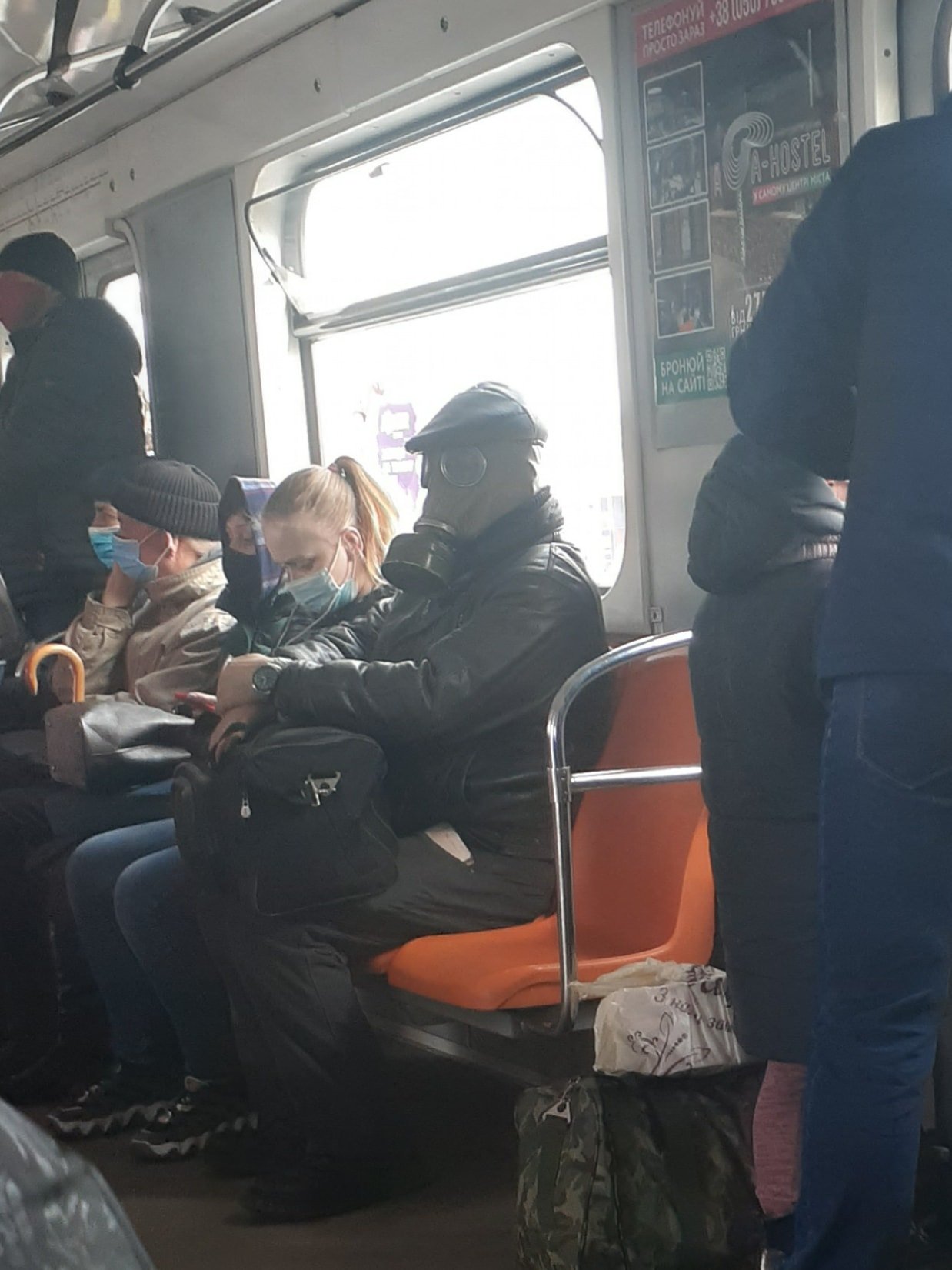 Другие пассажиры ехали во вполне традиционных медицинских масках. Автор фото извинилась, что опубликовала фото без согласия мужчины, но отметила, что личность мужчины все равно сложно узнать с таким снаряжением.