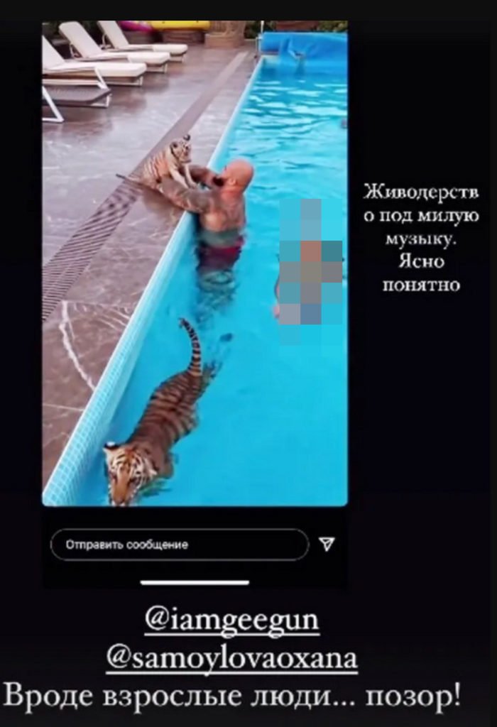 На опубликованных в соцсетях видео Джиган и Самойлова с детьми и вправду плавали с тигрятами в бассейне, барахтались на траве, без конца фотографировались.