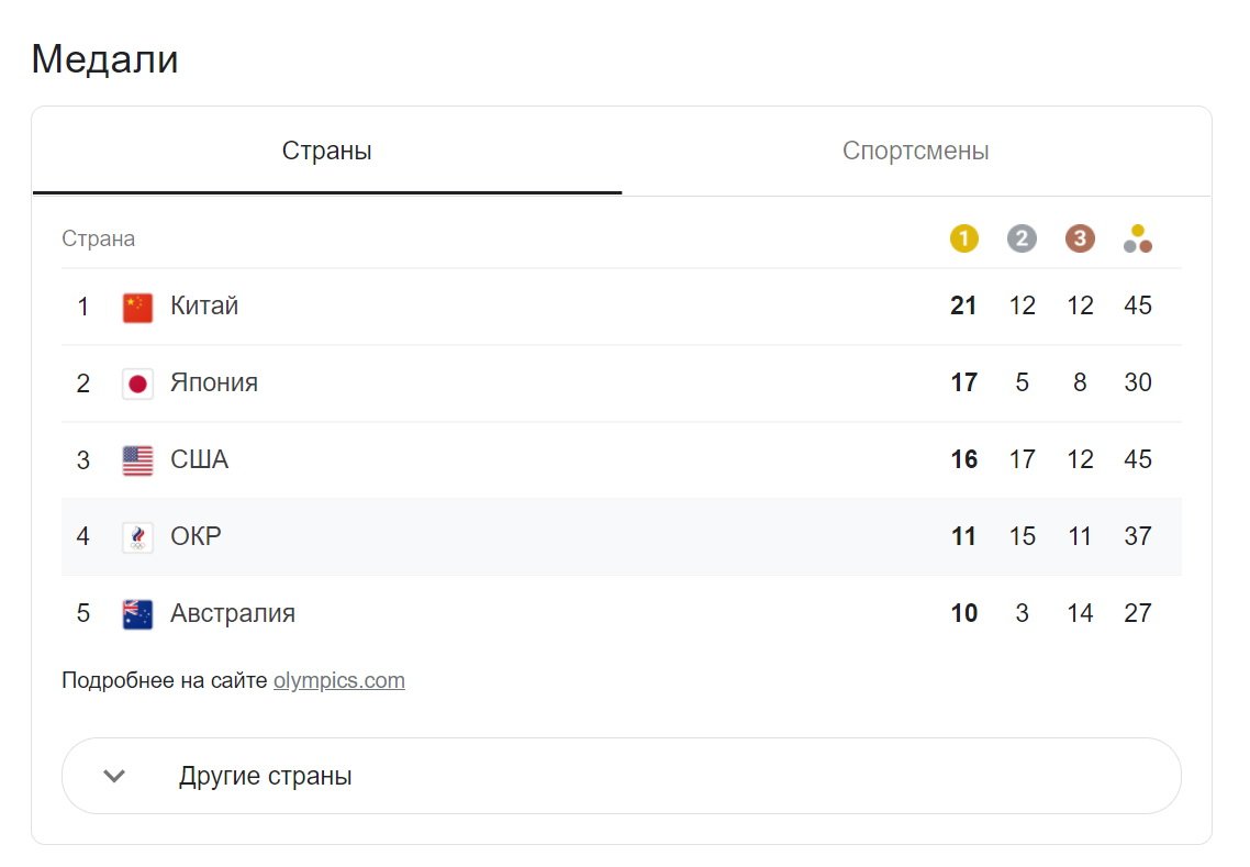 Олимпиада 2020 (2021) в Токио. Медальный зачет 31 июля. Таблица