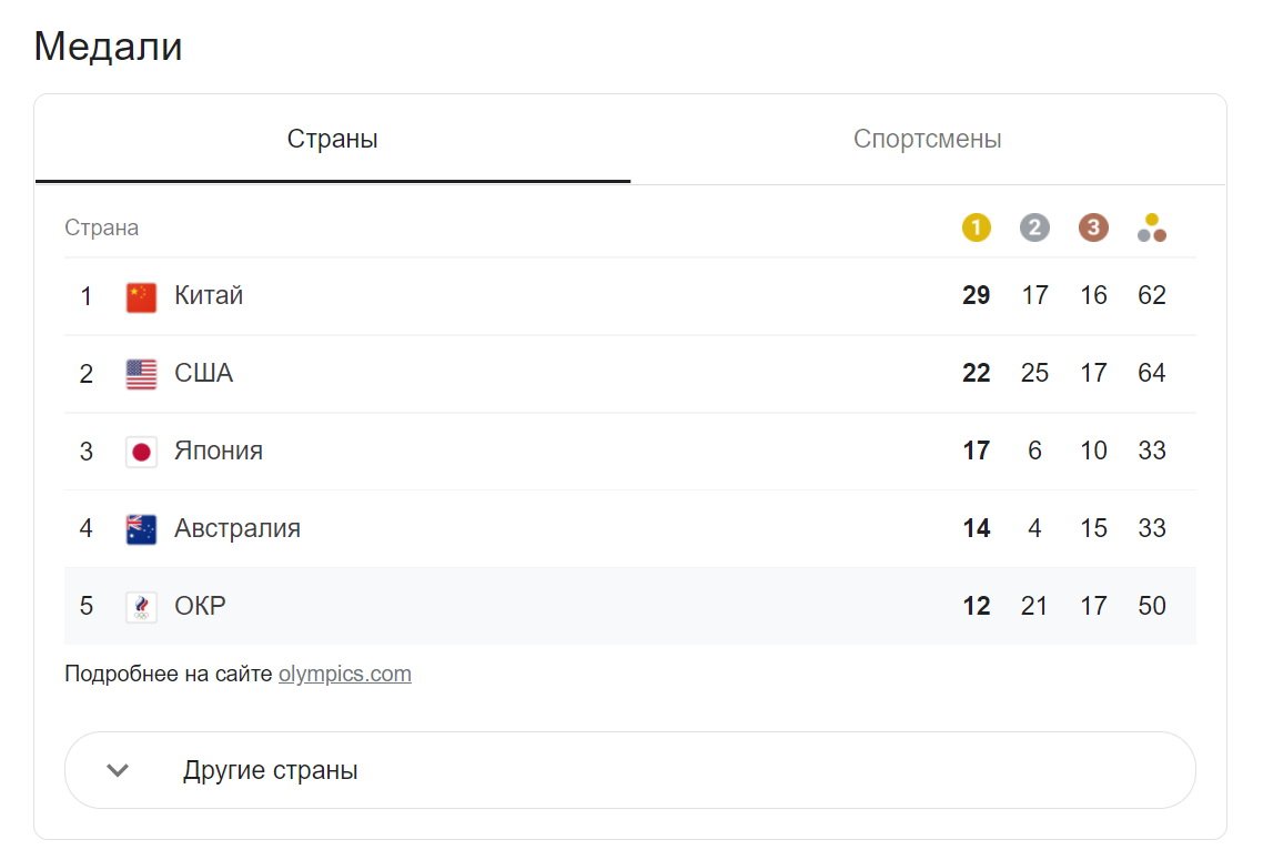Олимпиада 2020 (2021) в Токио. Медальный зачет 2 августа. Таблица