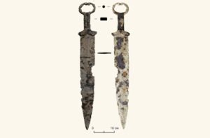 «Меч является увеличенной технологической модификацией традиционного тагарского кинжала. Общая длина меча — 59,5 см, ширина линзовидного в сечении клинка — около 7 см. Рукоять с волютовидным навершием отделена от клинка узким бабочковидным перекрестием», — описывают находку ученые.