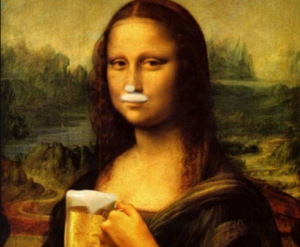На изображении всем известная Мона Лиза загадочно улыбается через пивные усы. В руках ее кружка с пенным напитком.