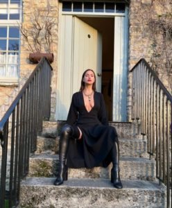 Модель надела миди-платье Burberry с разрезами на ногах и высокие кожаные ботфорты.