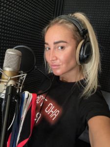 Артистка без макияжа, в простой черной футболке с красным принтом и с хвостом на голове расположилась перед микрофоном. На ее лице просматривались пигментные пятна от загара и следы усталости — круги под глазами.