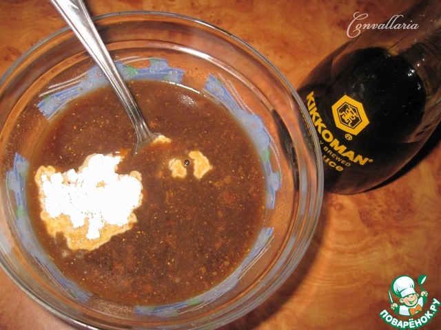 В миске соединить воду, соевый соус, имбирь, сахар, крахмал.