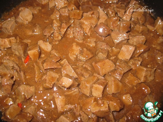 Влить полученный соус в сковороду с печенью и тушить еще 5 минут, постоянно помешивая. Соус должен загустеть.