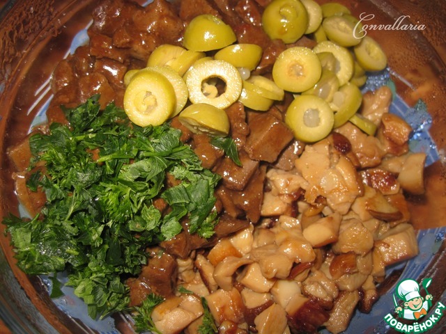 В глубокой емкости соединить грибы, печень, петрушку и оливки, нарезанные тонкими кольцами.