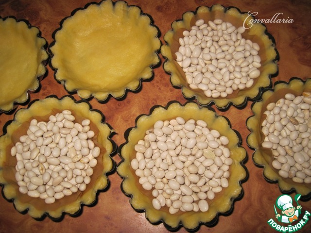 Охлажденное тесто разделить на 6 одинаковых частей. В формочки для тарталеток выложить тесто, плотно прижимая, чтобы оно хорошо покрывало дно и бока.