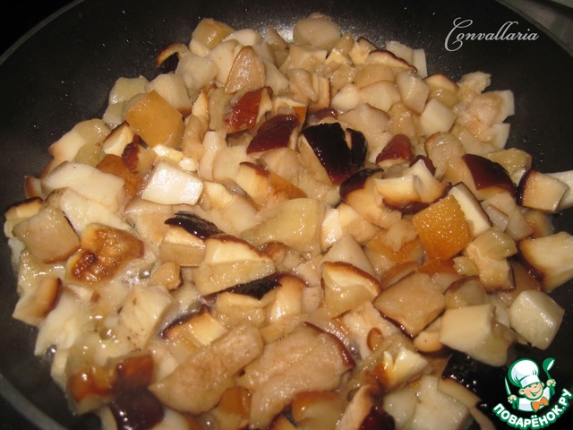Лесные грибы (у меня белые) хорошо промыть и нарезать небольшими кусочками. В сковороде разогреть немного растительного масла, переложить грибы и тушить под закрытой крышкой 30 минут до полного испарения жидкости. Грибы остудить.