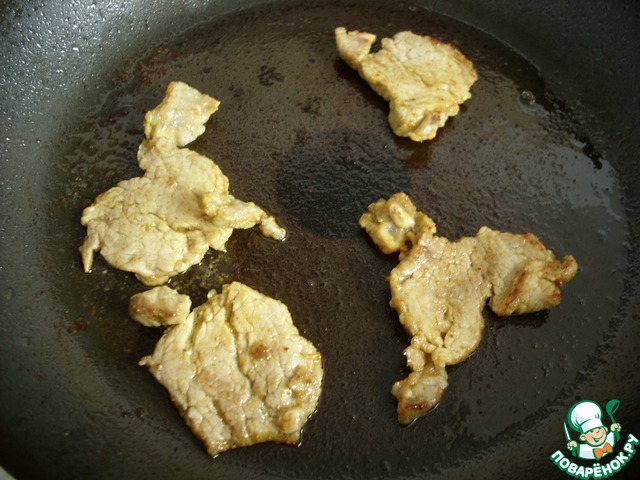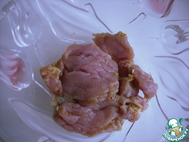 Свинину очень тонко нарезать, смешать с карри (по вкусу, предлагаю начать с 1 ч. л.) и лимонным соком. Поставить в холодильник мариноваться.