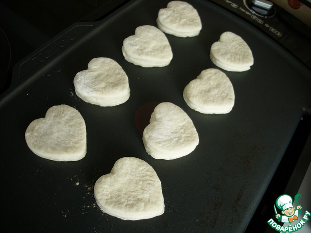 Дрожжи растворить в молоке, муку просеять и смешать с солью, добавить подсолнечное масло и молоко с дрожжами. Замесить тесто и оставить его в теплом месте без сквозняков, прикрыв салфеткой. Через 1,5-2 часа тесто раскатать в пласт 0,6-0,8 см и вырезать формой сердечки.