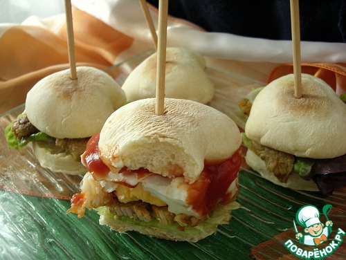 А также обжарить мясо. Из полученных ингредиентов сформировать бутерброды, не забыв положить листья салата, которые прекрасно сочетаются с кислинкой мяса.