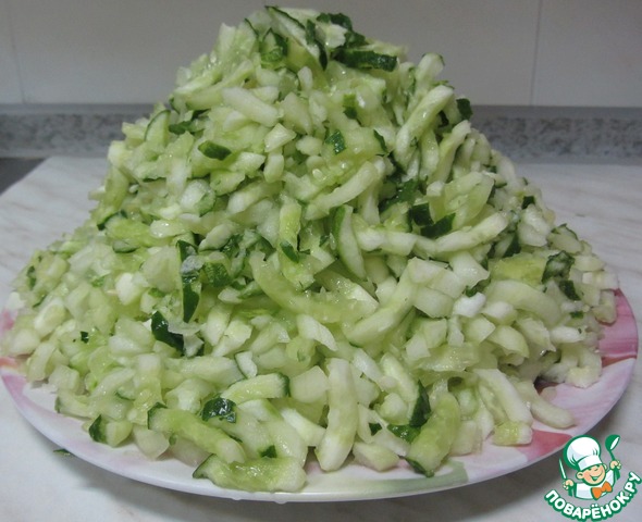 Огурцы нарезаем соломкой или кубиками, кому как нравится.