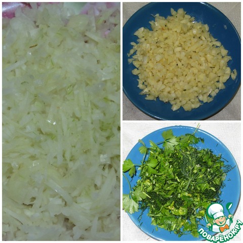 Измельчаем лук, чеснок и зелень.