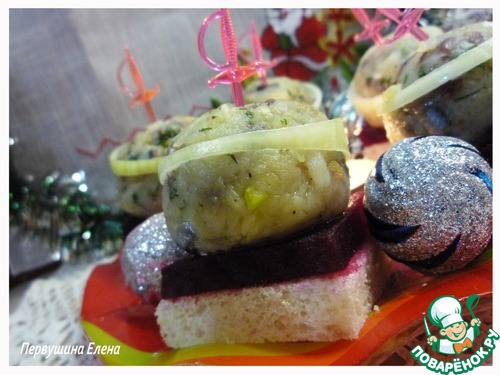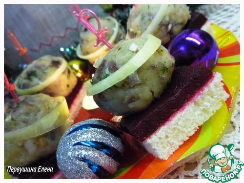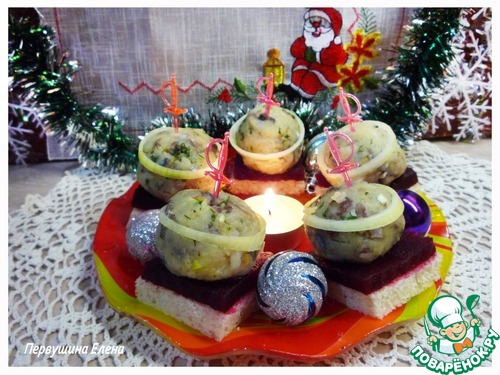 Украшаем кольцами лука рыбные "шары" и прокалываем пиками. Приятного аппетита!