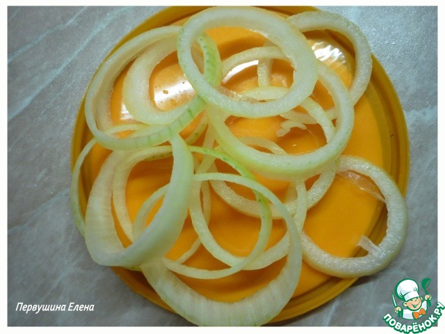 Лук режем кольцами, разделяем послойно и кладем в уксусную водичку. Все остатки (серединку и концы) нарезать кубиками и отложить пока отдельно.
