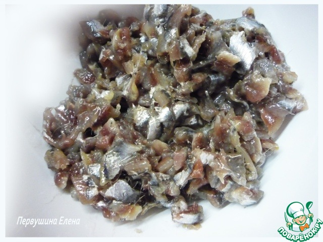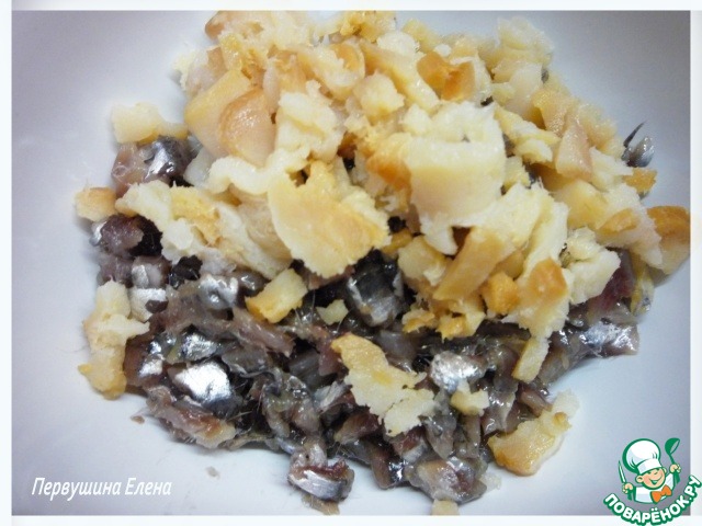 Масляную рыбу тоже режем мелкими кубиками и кладем к хамсе.