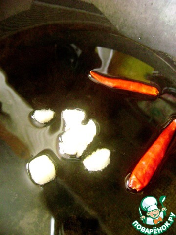 За неимением паэльи разогреть в воке или глубоком сотейнике оливковое масло. Прогреть в нем раздавленные ножом чеснок и стручки сушеного чили.