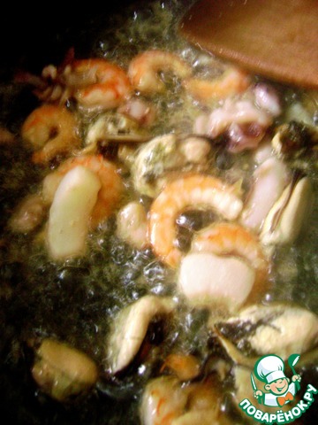 Вынуть и в масло положить креветки и морской коктейль. Обжарить, помешивая, минуту и вынуть на тарелку.