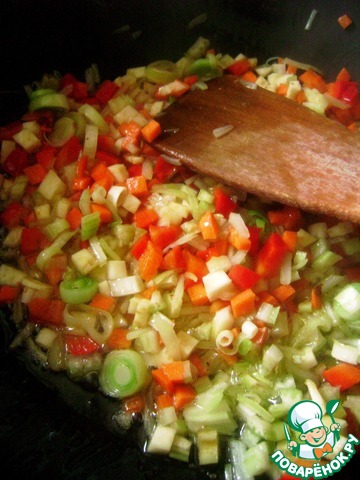 Опустить в масло овощи. Помешивая, пассеровать, не давая румяниться.