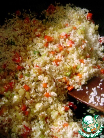 Всыпать рис и дать ему чуть поджариться и пропитаться маслом при постоянном помешивании.