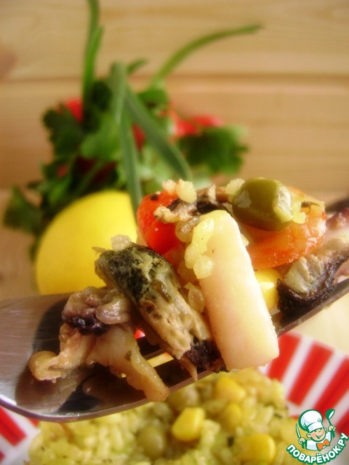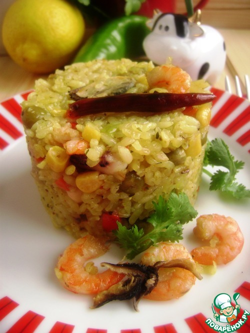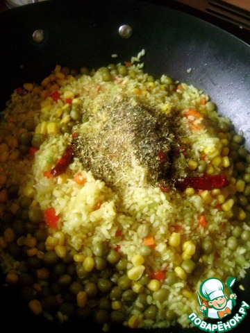 Через 10-12 минут добавить в паэлью горошек и кукурузу, посыпать пряностями, вернуть перец чили, добавить морепродукты и перемешать.