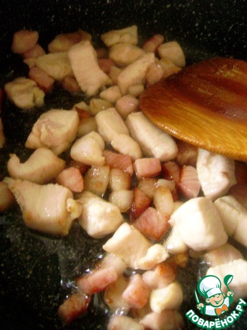 Пока паэлья настаивается и доходит, нарезать кубиками грудинку и куриное филе. Обжарить сначала грудинку, а потом в вытопившемся жире поджарить куриное филе. Полить лимонным соком, чуть присыпать сахаром, посолить и поперчить по вкусу.