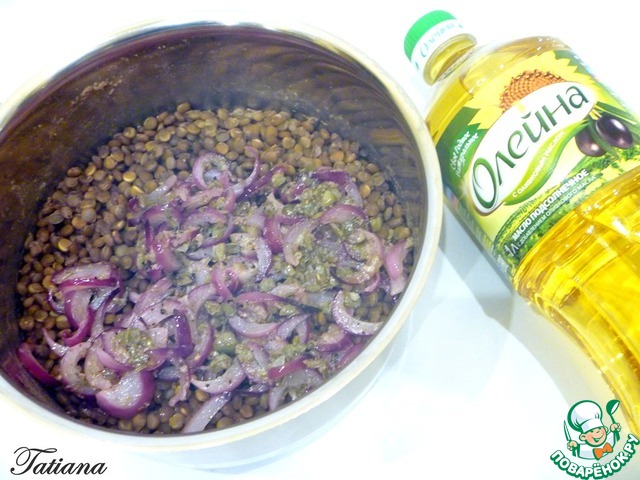 В готовую, теплую чечевицу, добавьте приготовленную горячую заправку, влейте пару ст. ложек подсолнечного масла, перемешайте.