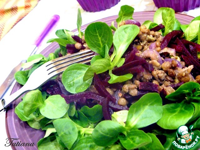 Свеклу (запеченную в фольге, в духовке при t=200 градусов 50-60 минут)нарежьте тонкой соломкой (удобно воспользоваться механической резкой). Салатные листья порционно положите на тарелку, сбрызните подсолнечным маслом, сверху выложите чечевицу и свеклу, по желанию присыпьте щепоткой крупной соли.