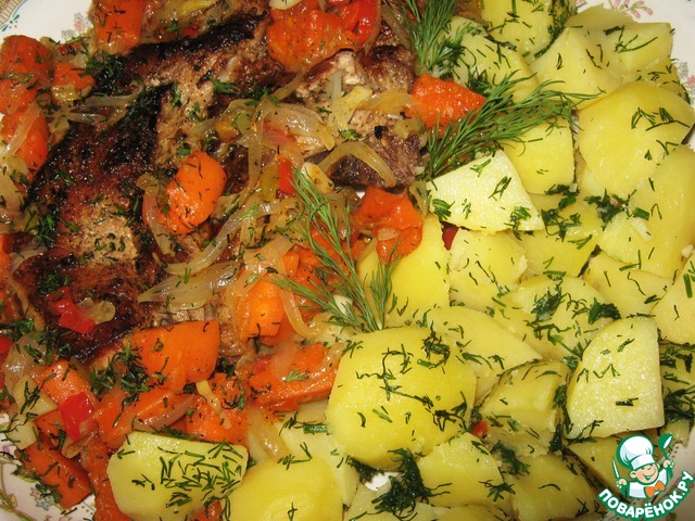 Мясо и овощи выложить на блюдо, посыпать измельченным укропом и можно звать родных к столу.
