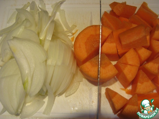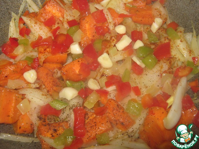 Добавить лук, обжарить. Затем добавить перец болгарский, нарезанный кубиком и пару зубчиков чеснока, обжарить. Выключить огонь.