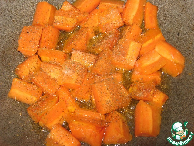 Морковь обжарить на растительном масле почти до готовности, присолить, добавить специи