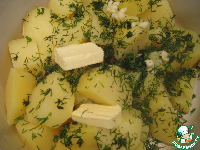 Картошку почистить, помыть, нарезать и отварить в подсоленной воде. Воду слить, добавить мелко нарезанный укроп, измельченный зубчик чеснока и сливочное масло. Перемешать.