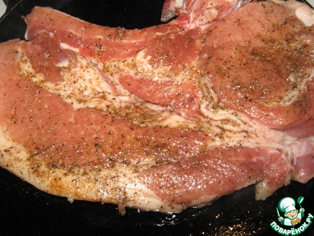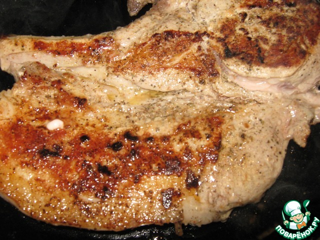 Свинину - у меня биток на кости, натереть солью, специями и растительным маслом. Выложить на сухую горячую сковороду, обжарить в течении пяти минут на небольшом огне.