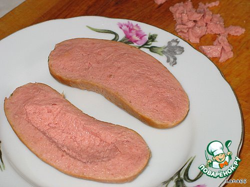 Сардельку отварить, немного остудить и аккуратно очистить от кожицы.