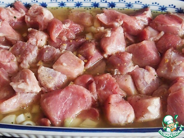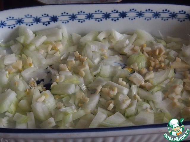Рецепт очень простой. Крупную луковицу порезать довольно крупно, чеснок на маленькие кусочки. Сложить в посуду, в которой будете запекать мясо.