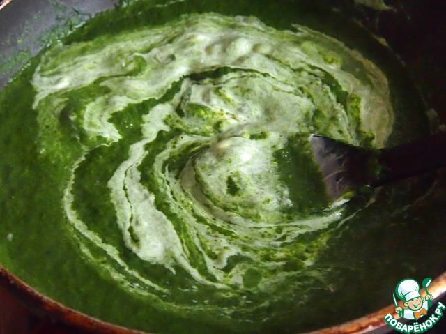 Я использую замороженный измельченный шпинат. Если будете использовать листовой шпинат, то потом соус нужно будет пробить в блендере до однородной массы.