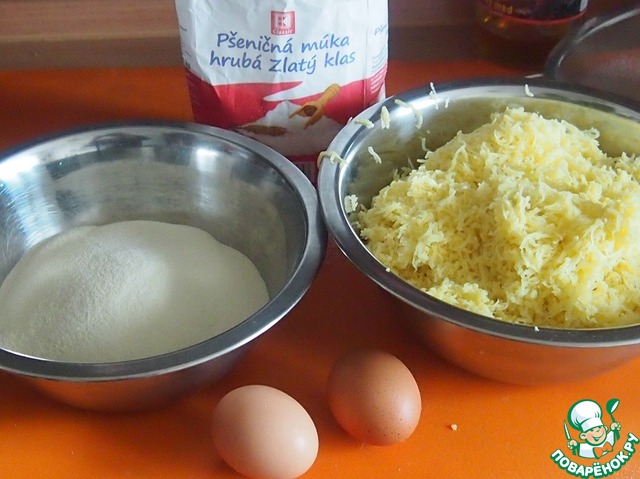 Теперь кнедлики. Если вы решитесь их готовить, то нужно заранее свалить картошку в мундире, очистить и остудить ее. Cами кнедлики преспокойно сделаете в то время, пока мясо тушится в духовке. Картошку натереть на мелкой терке. Добавить яйца, соль и муку. Если нет муки грубого помола, можно использовать и обычную, в этом случае, возможно, ее понадобится немного больше.