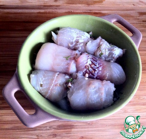 Рыбное филе посолить, поперчить. Выложить на каждую полоску немного начинки и свернуть рулеты. Выложить их в форму для запекания, смазанную маслом.