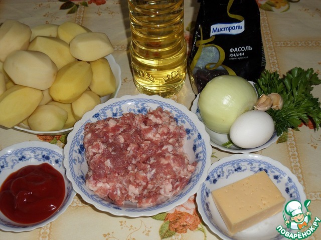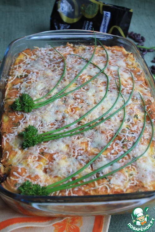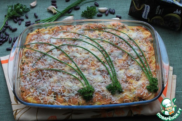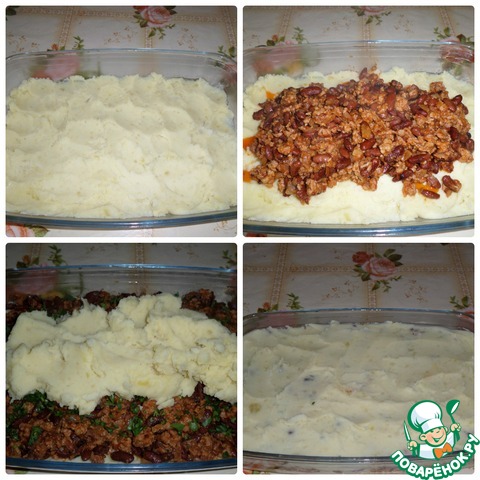 В смазанную форму выложить половину картофельного пюре, затем фасолево-мясную начинку, присыпать нарезанной зеленью. Поверх начинки выложить вторую половину картофельного пюре.