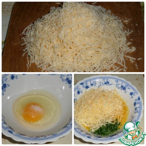 Натереть сыр. В чашку разбить яйцо. Добавить щепотку соли и слегка взбить вилкой. Затем добавить половину натертого сыра и зелень. Хорошо перемешать.