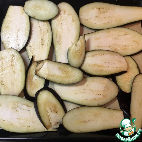 Баклажаны промыть, нарезать тонкими пластинками, посолить, оставить на 15 минут.
