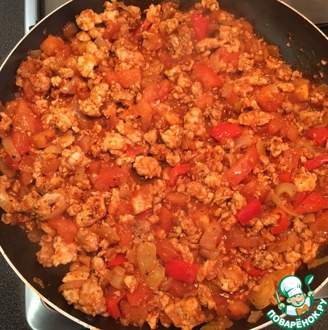 В стакане теплой воды развести 1 ст. л. томатной пасты. Влить к фаршу, приправить соус паприкой, перцем и базиликом, посолить по вкусу, хорошо все перемешать.