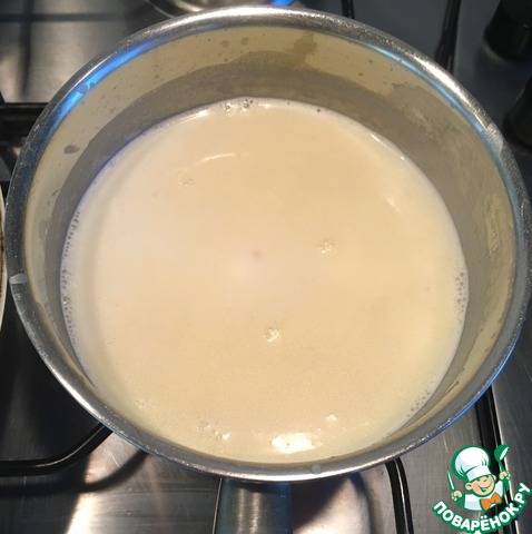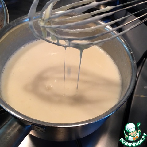 Продолжая мешать соус венчиком вливаем горячее молоко. Нагреваем наш соус, но не кипятим его.