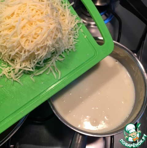 Добавляем в соус сыр, натертый на мелкой терке, мешаем венчиком, пока сыр не расплавится.