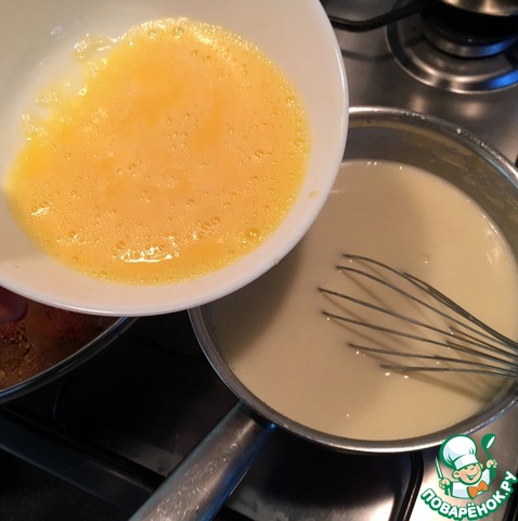 В отдельной миске взбиваем вилкой 2 яйца. Тонкой струйкой вливаем яица в соус, не переставая мешать венчиком.