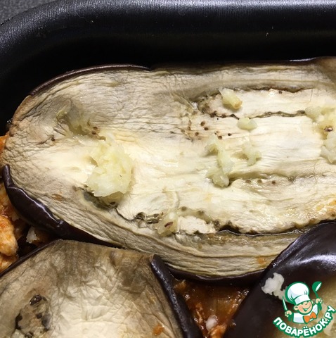 Повторяем слой мясного соуса и остатки баклажанов. Чеснок пропускаем через пресс и выкладываем на баклажаны.