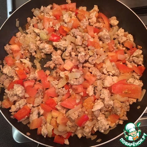Помидоры обдать кипятком, снять кожицу, нарезать кубиком. Перец болгарский так же нарезать кубиком. Отправить помидоры и перец в сковороду к фаршу.